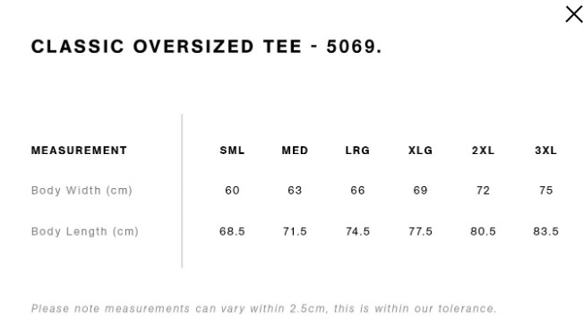 Construction: Neck ribbing, oversized fit with dropped shoulders, shoulder to shoulder tape, double needle hems, preshrunk to minimise shrinkage
