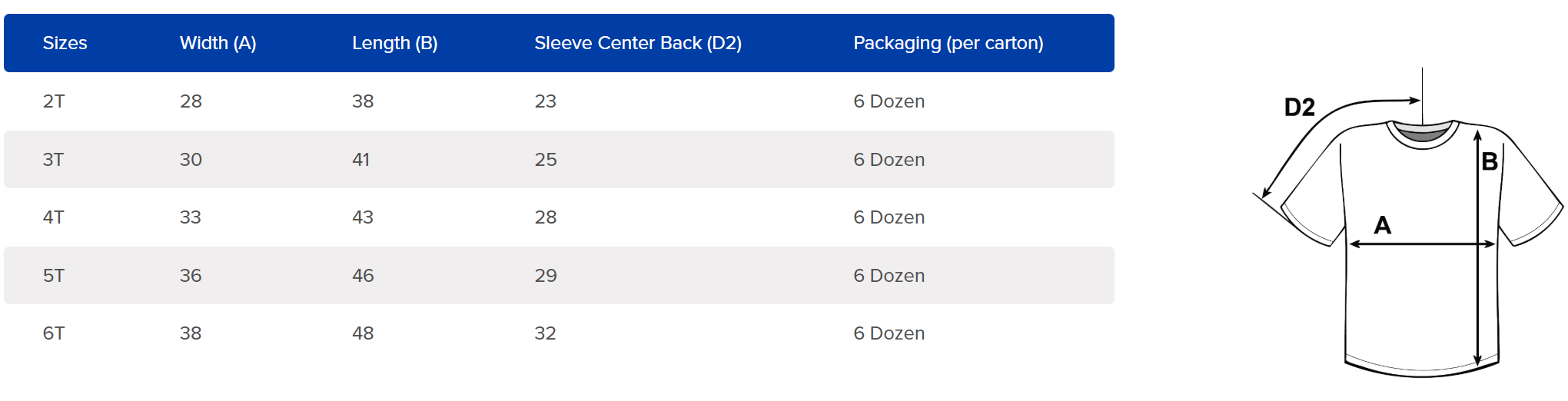 - 2T is equivalent to size S up to 6T is 2XL